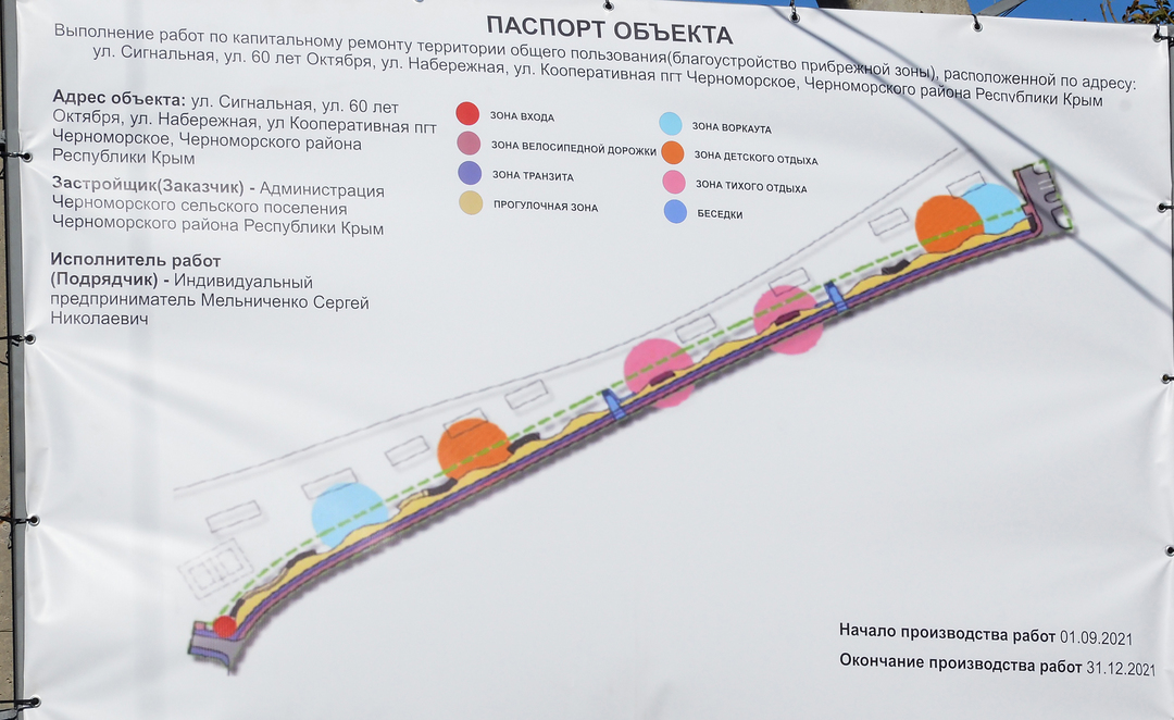 В поселке Черноморское продолжаются работы по благоустройству. Так, до конца текущего года будет реализован первый этап проекта по капитальному ремонту территории общего пользования (благоустройство прибрежной зоны) по ул. Сигнальная. После окончания работ здесь появятся велосипедные дорожки, прогулочная зона, беседки, зоны детского отдыха. На данный момент ведутся работы по демонтажу тротуарной плитки.